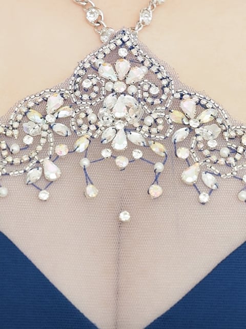 煌びやかなビジューが胸元からウエストまで贅沢にきらめくデザイン。