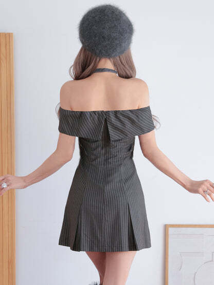 クロスネック/ストライプ/ビジューチャーム/ボタン/プリーツ/フレア/マイクロミニ
