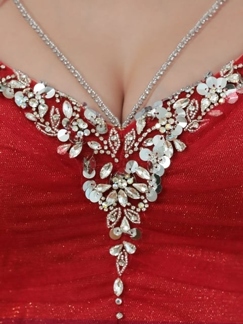 胸元のストーン装飾とカットデザインで、視線を惹きつける華やかさをプラス。